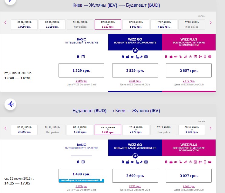 Крок 1. Київ – Будапешт, 5-13 червня – 69 євро для членів Wizz club. Для усіх пасажирів – 88 євро. У два боки.