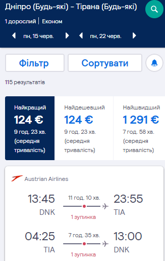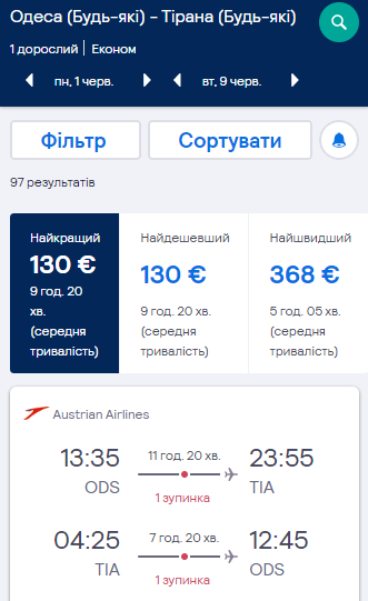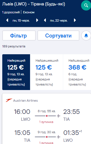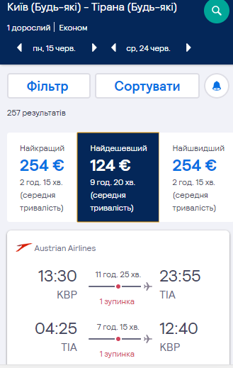 Ще приклади дат перельотів Київ – Тирана у два боки: