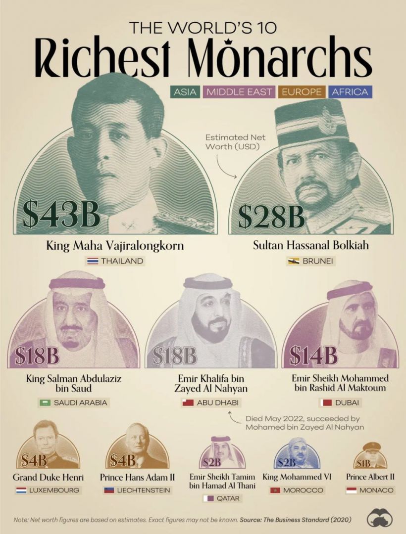Нижче надана інформація по трьом найбагатшим. На ілюстрації Ви побачите першу десятку. З нашої точки зору, крім перших трьох цікаві також 4-й і 5-й монархи – це правителі найбільших еміратів ОАЕ – Абу-Дабі та Дубаї.