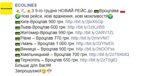 На сторінці ФБ автобусної компанії Ecolines з’явилося повідомлення про 50%-ну знижку на рейс до Вроцлава. Акція присвячена відкриттю нового маршруту до цього міста з різних міст України з 9 грудня.