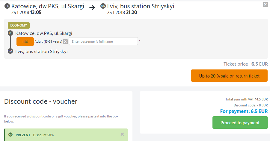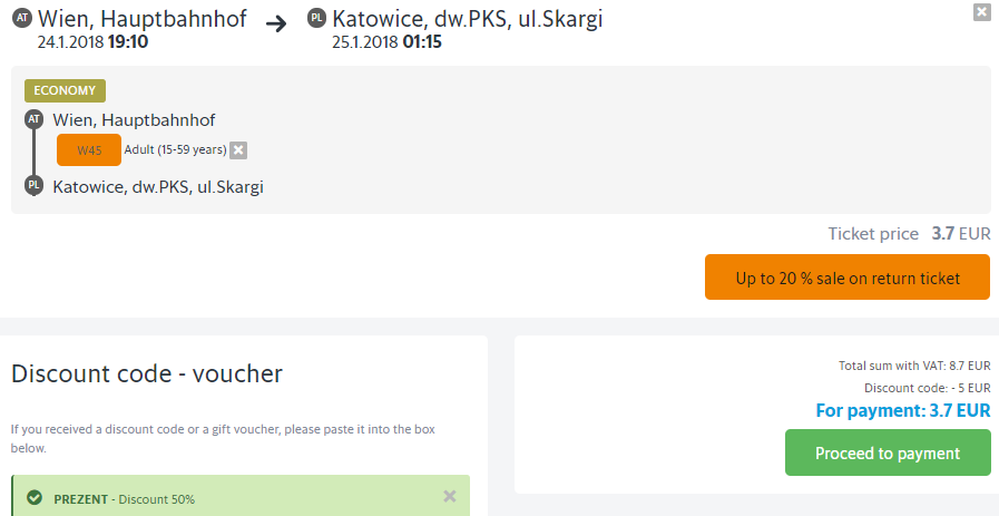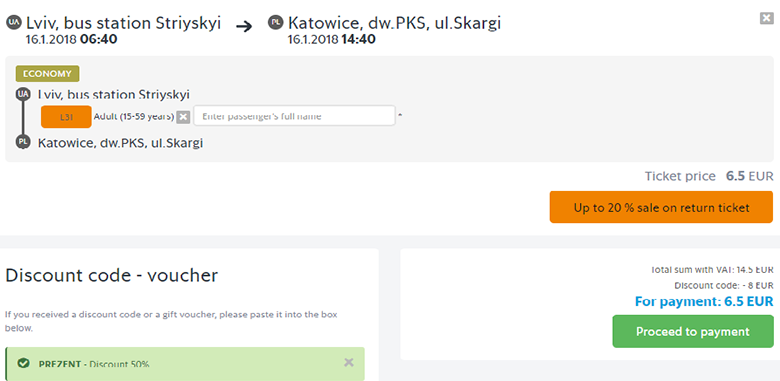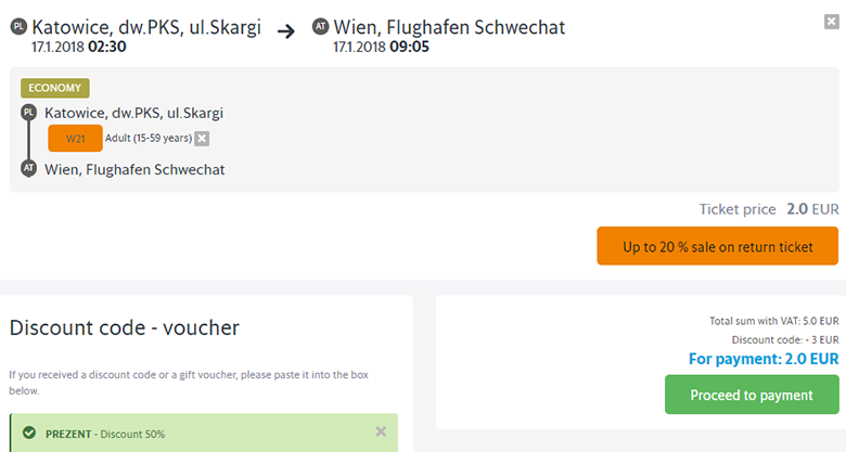 Билеты на автобусный рейс компании LEO express можно приобрести за €2 в одну сторону в рамках акции. Период путешествия – 08 января 2018 г. – 28 февраля 2018 г. Билеты бронируем до 9 декабря 2018 г. Акция распространяется на поездки по вторникам, средам, четвергам и субботам. Промокод – PREZENT.