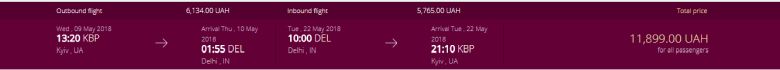 Київ – Делі, 9-22 травня – 372 євро у два боки. По дорозі у Делі пересадка у Досі 55 хв. назад – 4 години.