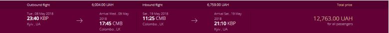 Київ – Коломбо, 8-19 травня- 398 євро у два боки. Туди – пересадка 4 год 50 хв. назад – 1 год.30 хв.
