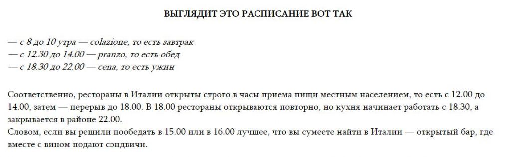 Если вам захочется попробовать истинно итальянскую кухню – сохраните это расписание (в некоторых городах оно сдвигается на минут 30-45, имейте в виду, проверьте его расписание, обычно вывешенное на двери.