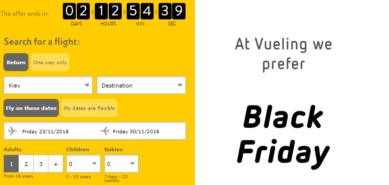 - BLACK20ES – Скидка на все рейсы в/из Испании с 11 декабря по 31 марта.