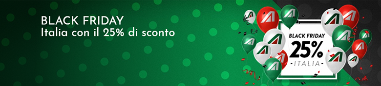 - BLACK25 – Скидка распространяется на все рейсы Alitalia для вылетов в/из Италию с 28 ноября по 19 декабря.