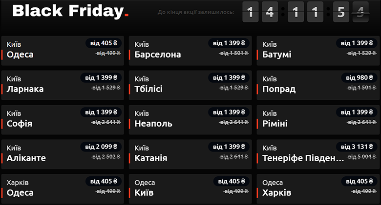 Авиакомпания Wizz Air уже не первый год бойкотирует Черную Пятницу, вместо этого устраивает свою – Розовую и предлагает скидку 20%. Забронировать билеты можно только 23 ноября. Период путешествий неограничен.