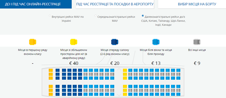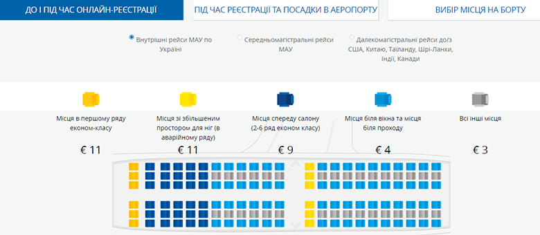 Вибір місць на внутрішніх рейсах МАУ по Україні коштує від €3 до €11. Наприклад, місця біля вікна та біля проходу коштують €4, місця зі збільшеним простором для ніг – €11.