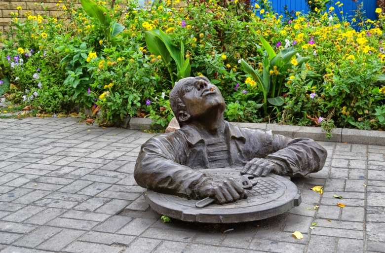 А вот бердянский сантехник – беззаботно смотрит в небо, чем умиляет туристок, норовящих поцеловать героя и отдать ему букет цветов.