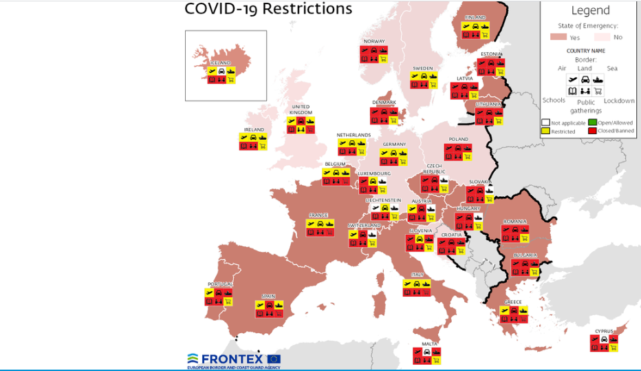 Європейське агентство прикордонної і берегової охорони Frontex підготувало карту для відстеження тимчасових обмежень, які існують у ЄС, Шенгенській зоні та Великобританії для боротьби з COVID19.