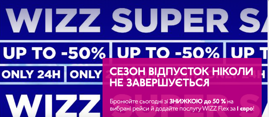 Авіакомпанія-лоукостер Wizzair пропонує знижку до 50% на авіаквитки за всіма напрямками і послугу Wizz Flex за €1. Акція діє лише один день. Знижка діє на рейси з вересня 2020 до вересня 2021