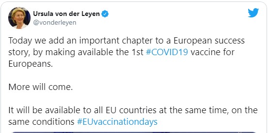 “Сьогодні ми додамо важливу главу в історію європейського успіху. Ми схвалили першу безпечну і ефективну вакцину проти COVID-19. Скоро з’являться нові вакцини. Дози вакцини, затверджені сьогодні, будуть доступні для всіх країн ЄС, в один і той же час, на одних і тих же умовах. Майбутні європейські дні вакцинації також стануть великим моментом єдності. Це хороший спосіб закінчити цей важкий рік і почати перегортати сторінку цієї пандемії “- сказала президентка Єврокомісії Урсула фон дер Ляйен.