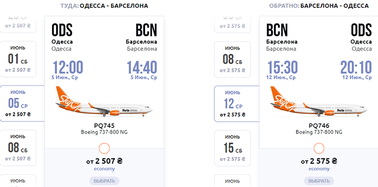 | Одеса – Барселона | Ср, сб | 12:00 | 14:40 | 25.05.19 |