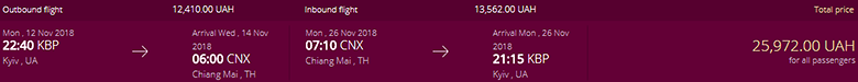 Для примера предлагаем перелет из Киева в Чиангмай. Даты – 12-26 ноября. Стоимость перелета в обе стороны для двоих составит €806 (€403 для каждого из пассажиров). Перелет с пересадкой в Дохе. По дороге в Таиланд подождать в столице Катара придется 14 ч. 50 мин., на обратном пути – 5 ч. 10 мин.
