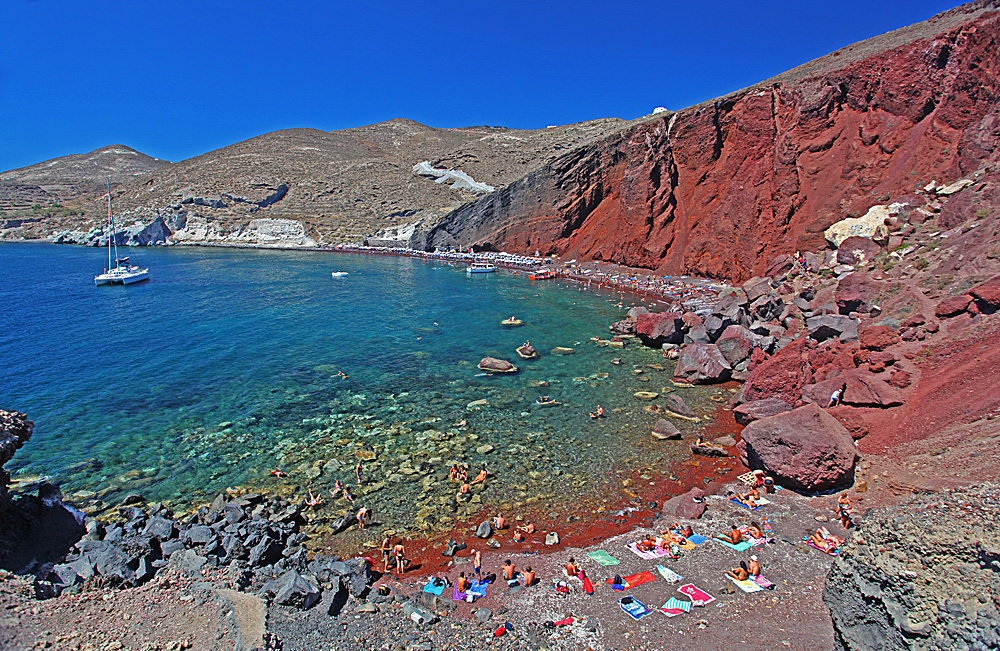 Красные пляжи не самая большая редкость, но не упомянуть о них мы не можем. Чтобы увеличить интенсивность окраски песка на пляже с розовой до красной, вам даже не придется покидать Грецию. Самый близкий к нам из известных красных пляжей находится на острове Санторини, недалеко от городка Акротири. Пляж невелик, но ничего более красного в Европе вы точно не найдете.