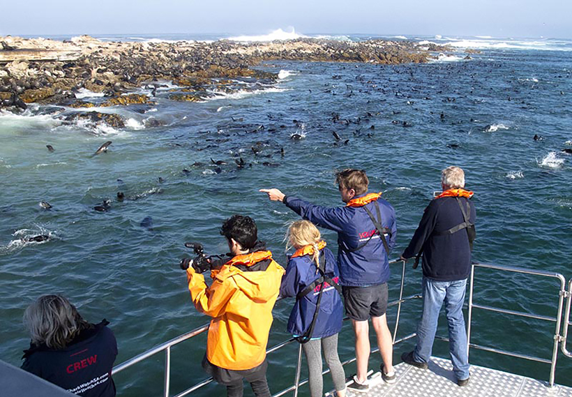 Берега Южной Африки, особенно острова Дайер и Гейзер Рок облюбовали морские котики. Каждый год сюда приезжают миллионы туристов, чтобы посмотреть на них. Но не стоит забывать, что эти котики являются главным лакомством белых акул. Поэтому этот регион стал территорией обитаний Запечатлевая милых котиков, не забывайте, что рядом плавают акулы. На пляжах Гансбай предлагают еще одно развлечение – погружение на дно моря в клетке. Акулы, видя человека, считают его обедом и пробуют сломать своими челюстями металлические прутья, чтобы получить свое «лакомство».