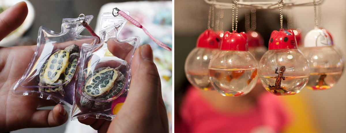 По какой-то причине китайские предприниматели считают такие сувениры невероятно милыми и забавными. Живые существа, запаянные в пластик, даже с питательной средой внутри, просто обречены на медленную и мучительную смерть. Такой сувенир может приснится европейскому туристу только в кошмарах – поистине жестокий подарок. Защитники животных активно борются против таких зверств, но Китай – дело тонкое.