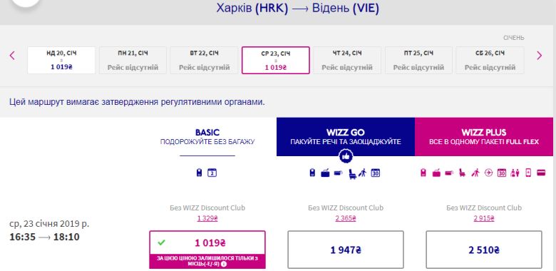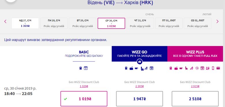 Харків – Відень, 23-30 січня- 65 євро для учасників Wizz club, інші пасажири – 84 євро.