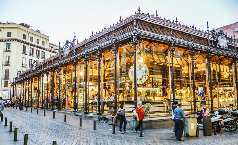 Еще одна гастрономическая гордость Испании – мадридский рынок, существующий с 1915 года. Уникальное здание из чугуна, а ларьки внутри украшены керамикой. Здание полностью реконструировали, сохранив его первоначальный вид. Обязательно зайдите в тапас-бар, чтобы отведать бесподобные закуски кастильской кухни. Предлагаем взять томленные в вине креветки на тостах, жаренный во фритюре сыр камамбер с инжиром и сардины на подушке из маринованных овощей.