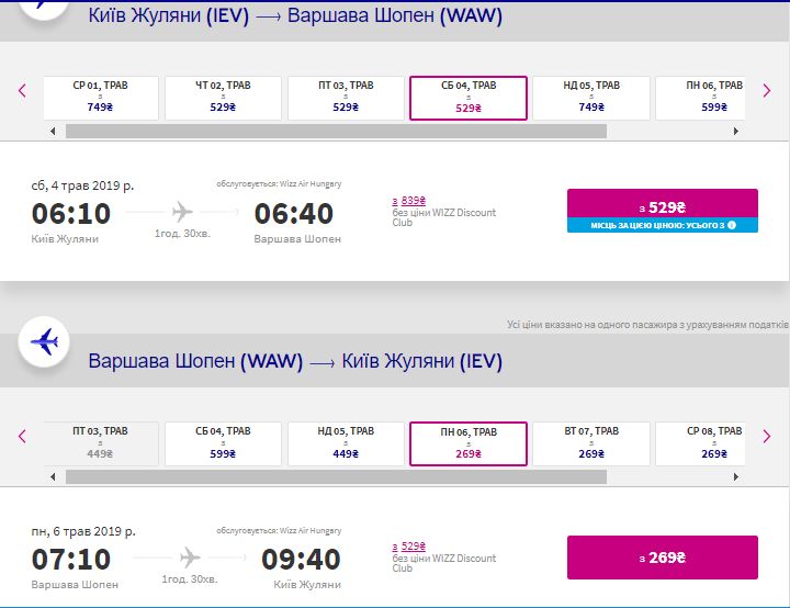 Київ – Варшава, 4-6 травня – 25 євро для учасників wizz club та 44 євро для інших