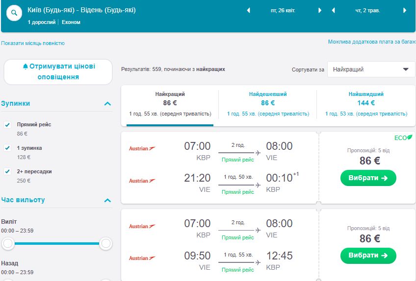 Київ – Відень, 26 квітня-2 травня – 86 євро (Austrian Airlines)