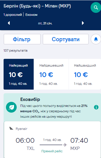 Дата: 31 січня. Ціна перельоту в один бік — €10.