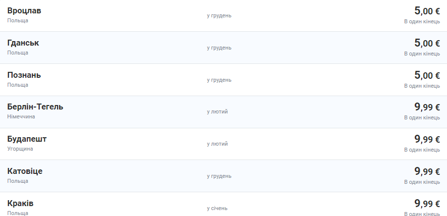 Мінімальна ціна €5 в один бік пропонується на рейси з Одеси до Вроцлава, Гданська та у Познань: