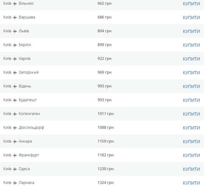 ДеталіПриклади цін на деякі рейси з Києва: