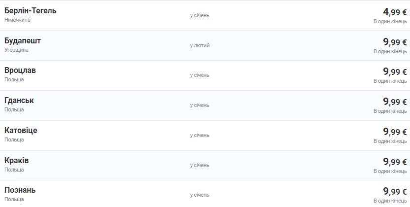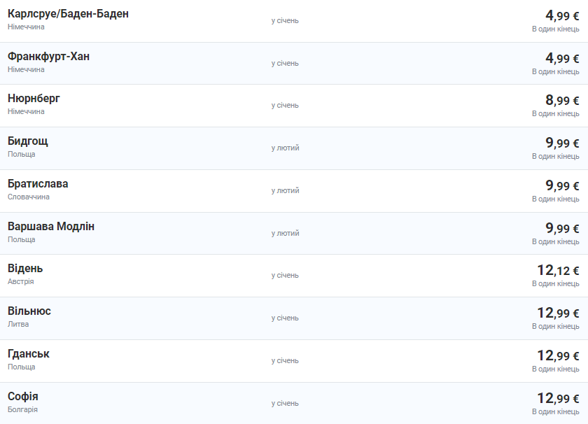 Авіакомпанія Ryanair пропонує недорогі ціни на рейси з міст України до Європи. Вартість квитків стартує від €5 в один бік. Найнижчі ціни з Києва та Одеси.
