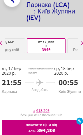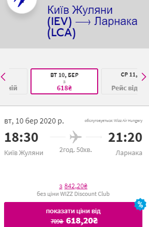 Київ — Ларнака, 10-17 березня. Ціна — €38 для учасників wizz-клубу та €55 для всіх.