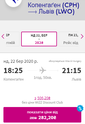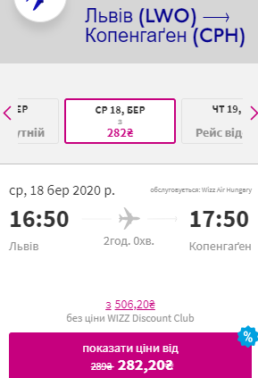 Львів — Копенгаген, 18-22 березня. Ціна — €22 для учасників wizz-клубу та €38 для всіх.