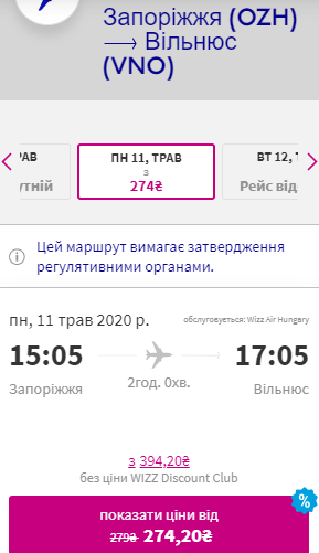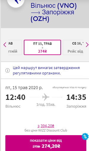 Запоріжжя — Вільнюс, 10-17 березня. Ціна — €22 для учасників wizz-клубу та €30 для всіх.