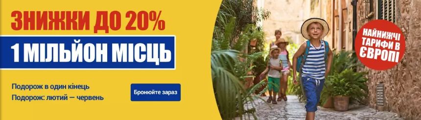 Авіакомпанія Ryanair оголосила черговий розпродаж 1 млн. квитків зі знижкою до 20%. Ціни з міст України від €9 в один бік.