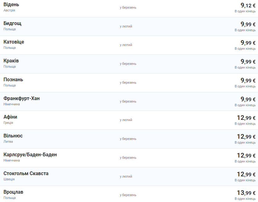 Найдешевші квитки за €20 у два боки на даний час: з Одеси в Катовіце, Познань, Вроцлав, Гданськ, з Харкова у Вільнюс, з Херсона в Катовіце, Краків, зі Львова в Дюссельдорф, з Києва у Відень, Катовіце, Бидгощ.