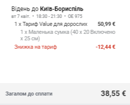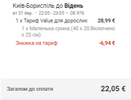 Дата: 31 березня. Вартість квитка в один бік — €22. Виліт з аеропорту Бориспіль.