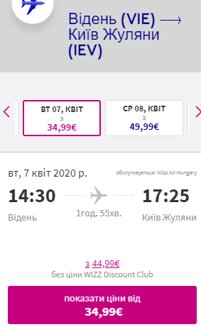 Другий варіант перельоту 7 квітня. Ціна квитка — €35 для учасників wizz-клубу та €45 для всіх інших. Авіакомпанія – Wizz Air. Приліт в аеропорт Київа (Жуляни).