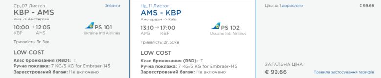 Київ – Амстердам, 7-11 листопада – 99,6 євро у два боки