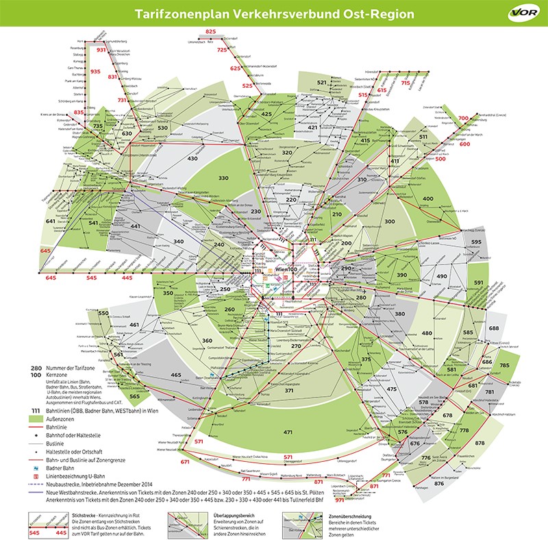 Билет в Вене является единым и действует для всех видов общественного транспорта в пределах так называемой «тарифной зоны 100». В указанную зону входят все линии в Вене (поезда, электрички, автобусы, трамваи, метро, большинство региональных автобусных маршрутов) за исключением САТ («City Airport Train» – скоростной поезд до венского аэропорта) и автобусов до аэропорта.