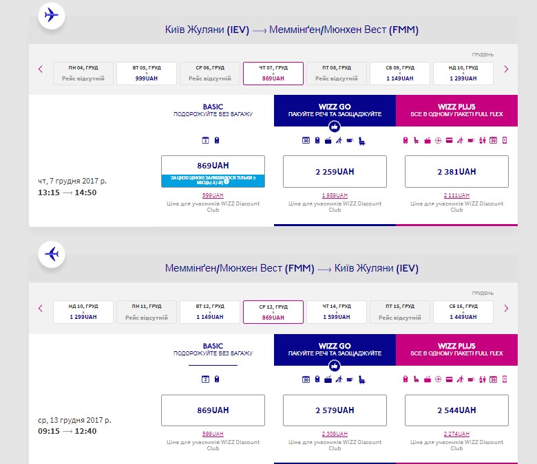 Київ – Меммінген, 7-13 грудня – €42 (для членів Wizz club)