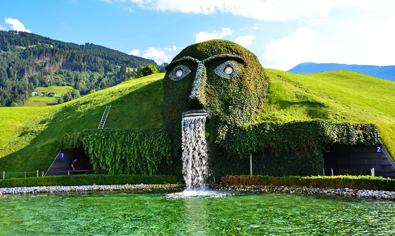 Чтобы попасть в музей, надо пройти мимо головы великана. У него есть два громадных зеленых глаза из кристаллов Swarowski, а изо рта извергается водопад. Гид посоветует не сердить хозяина здешних гор бросить в фонтан монетку. Тысячи туристов так и делают, после чего отправляются осматривать блестящие экспонаты музея.