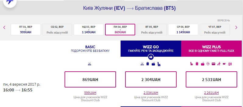 З 4 по 8 вересня можна полетіти у столицю Словаччини Братіславу за €36 (для членів Wizz club). Для звичайних пасажирів ціна складає €56.