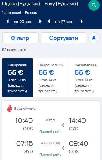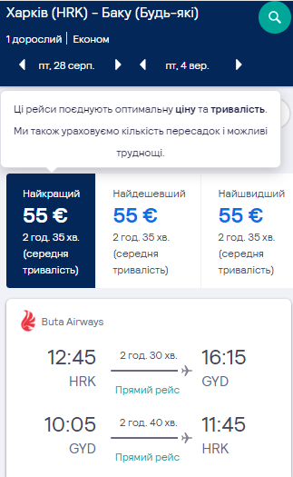 Підібрати необхідні дати та забронювати квитки можна на сайті Buta Airways або на Skyscanner.