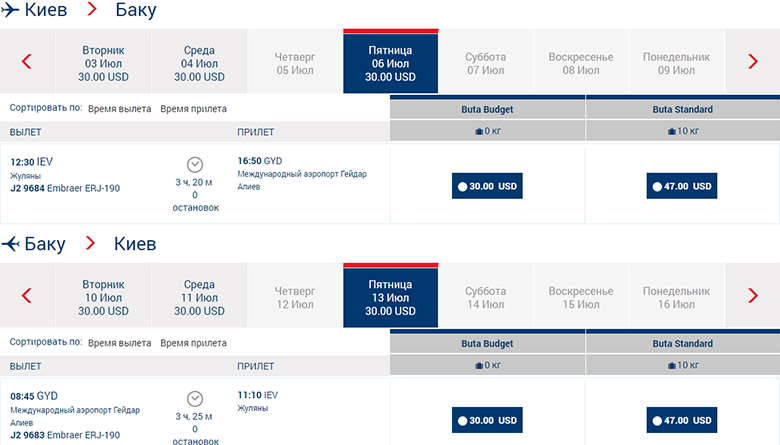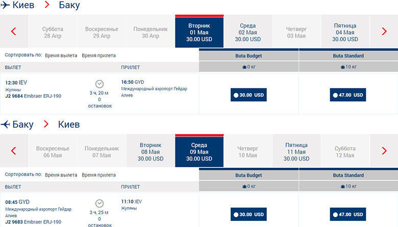 Buta Airways предлагает авиабилеты на рейс Киев – Баку по цене $30 в одну сторону с апреля по октябрь 2018 г.