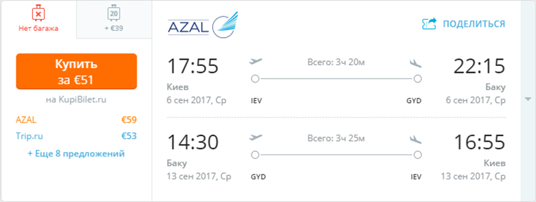 Для тех, кто путешествует налегке можем предложить прямой перелет Киев – Баку. Azerbaijan Airlines домчит вас до столицы Азербайджана и обратно всего за €51 (туда-обратно). Поездку планируем на 6-13 сентября. К слову, за багаж весом до 20 кг нужно будет доплатить еще €39.