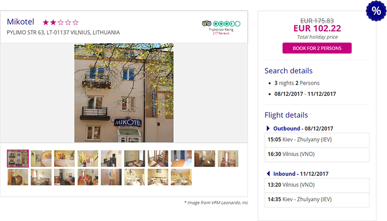Для примера предлагаем с 8 по 11 декабря посетить Вильнюс. Проживание в отеле Mikotel и прямой перелет из Киева для двоих обойдется в €102. В данном случае скидка составит почти €74.