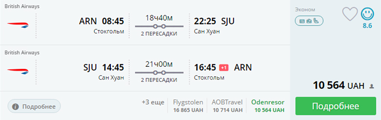 Переліт з Швеції до острова Пуерто-Рико з двома пересадками, але коштує всього 354 євро в обидва боки.