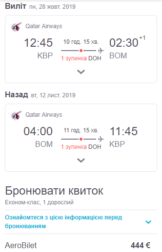 Київ – Мумбай, 28 жовтня-12 листопада – 444 євро