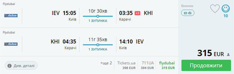 Недорогий переліт flydubai Київ – Карачі з пересадкою в Дубаї за 315 євро в обидва боки.
