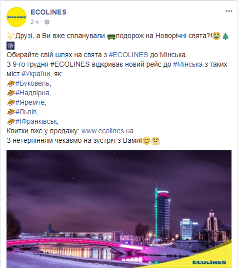 Нові рейси Ecolines до Мінська з різних міст та курортів України: Буковель, Надвірна, Яремче, Львів, Івано-Франківськ. Перший рейс заплановано на 9 грудня. Квитки вже в продажу.