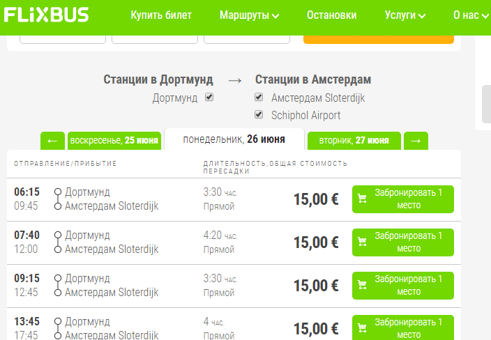 Из Дортмунда в Амстердам едем на отличном автобусе компании Flix Bus. 26 июня, время можно выбрать любое по вкусу (см. скриншот) за 15 евро. Сайт для бронирования – flixbus.ru.